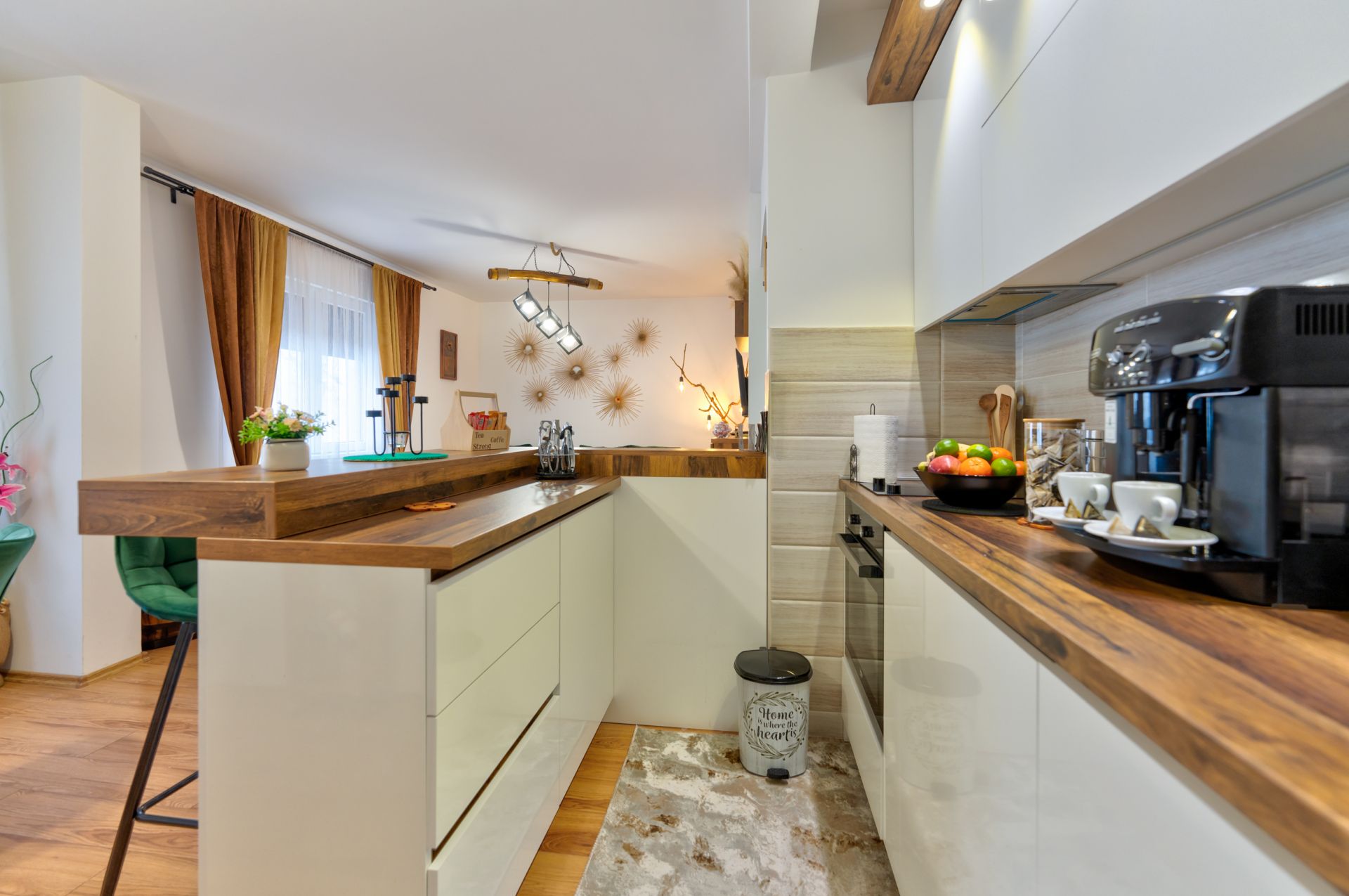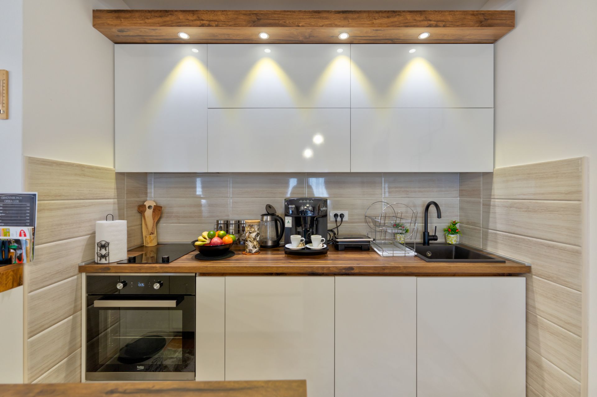 Dnevni boravak apartmana Opera Lux poseduje ugaonu garnituru na rasklapanje, ogroman LCD TV, kao i ukrasni kamin za romantičnu atmosferu. Savremena kuhinja apartmana je potpuno opremljena, a poseduje ravnu ploču za kuvanje, rernu, ugradni frižider, aparat za espreso kafu, toster, ketler, kao i svo neophodno posuđe i pribor za jelo i pripremu hrane.