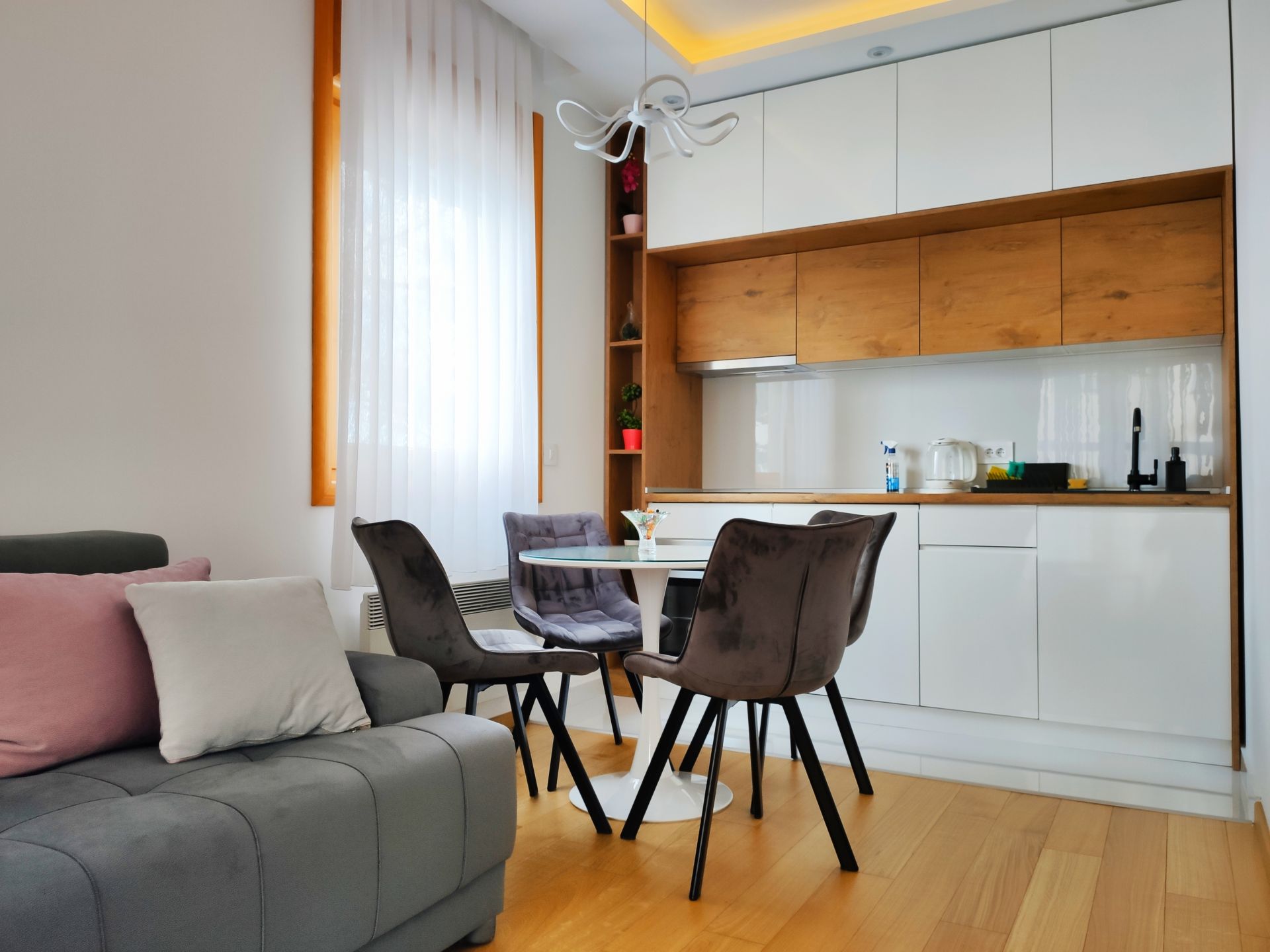 Zgrada poseduje lift, sa kojim se može spustiti do garaže. Apartman je vrlo pažljivo dizajniran i opremljen, sa vrlo kvalitetnim nameštajem i elektronskim uređajima, kako bismo zadovolji potrebe današnjeg modernog gosta.