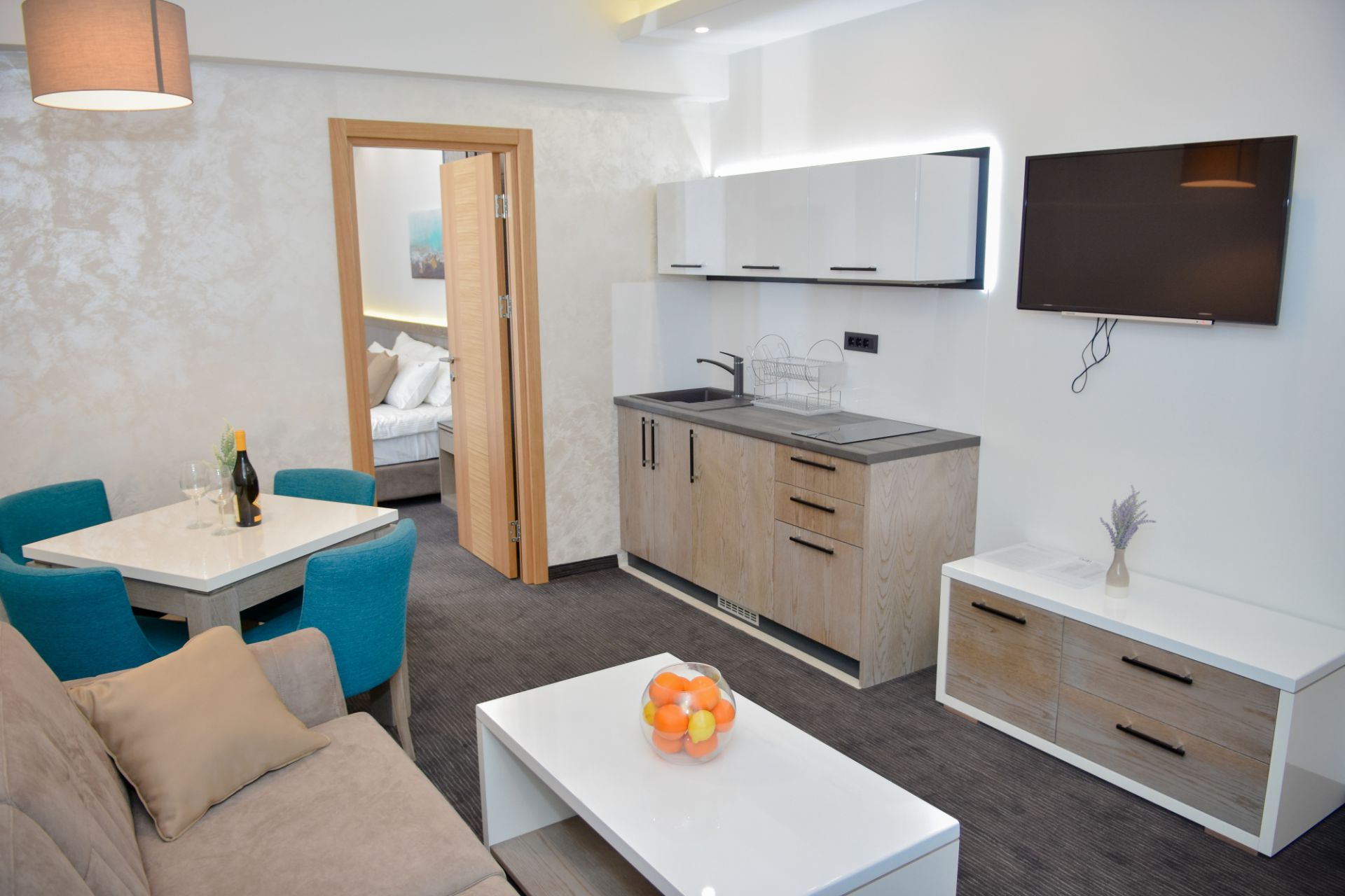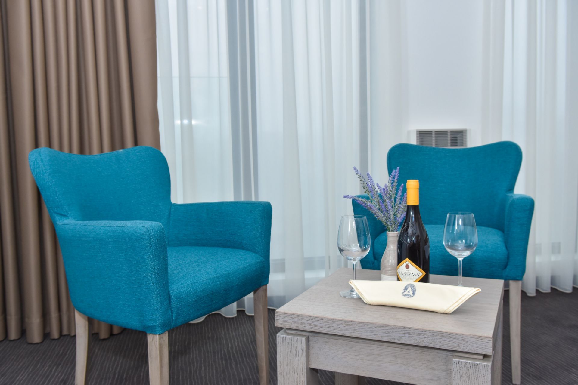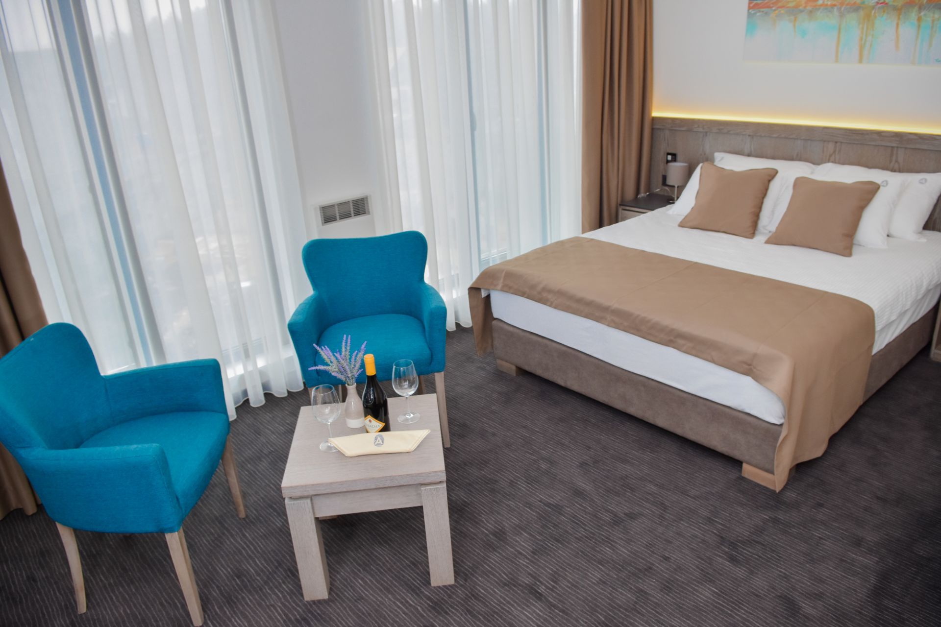 Ukupan kapacitet objekta je 110 ležaja raspoređenih u 42 smeštajne jedinice, odnosno 37 soba i 5 apartmana ekskluzivno opremljenih kvalitetnim i modernim nameštajem uz implemetaciju najsavremenije hotelske tehnologije po ugledu na svetski poznate hotele. Svojom udobnošću i karakteristikama smeštajne jedinice ovog objekta odgovoriće na zahteve i najvećih hedonista. Sve sobe i apartmani poseduju TV sa ravnim ekranom i kablovskim kanalima, bežični internet i mini-bar. Gostima je na raspolaganju i rum servis.