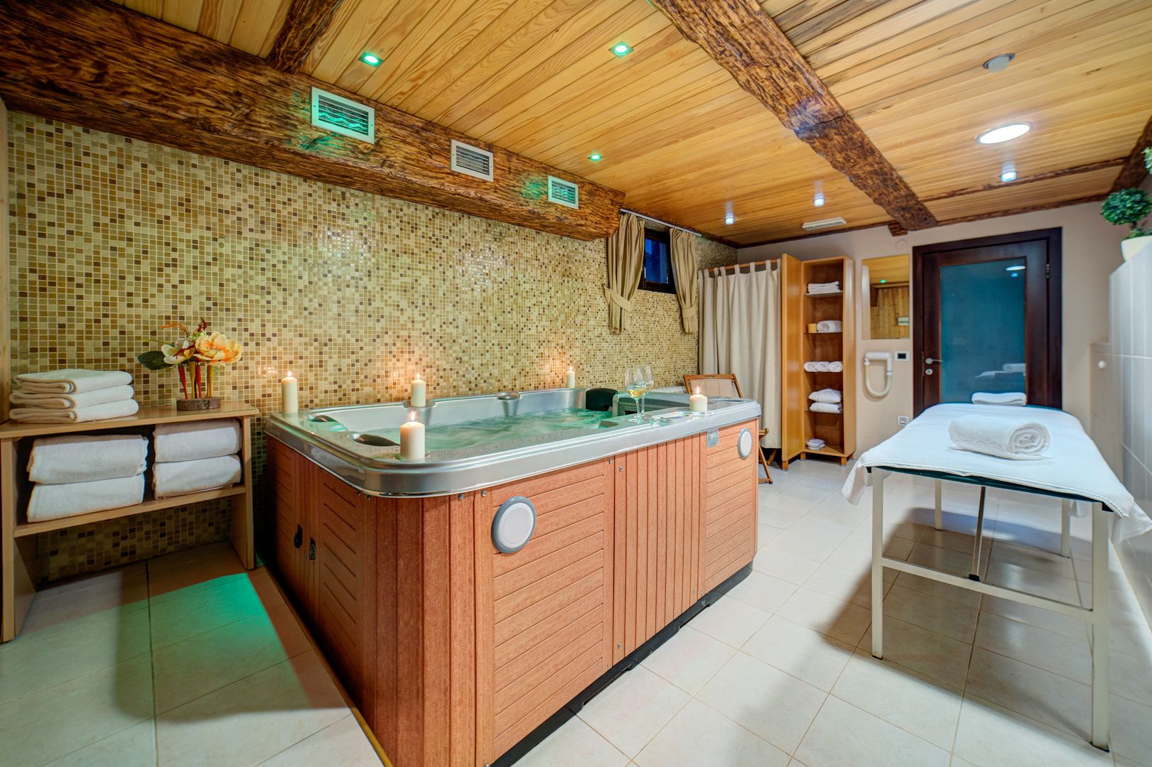 Za potpuno uživanje i relaksaciju gostima Vile Pina na raspolaganju je mini velnes sa finskom saunom i hidromasažnom – jacuzzi kadom.